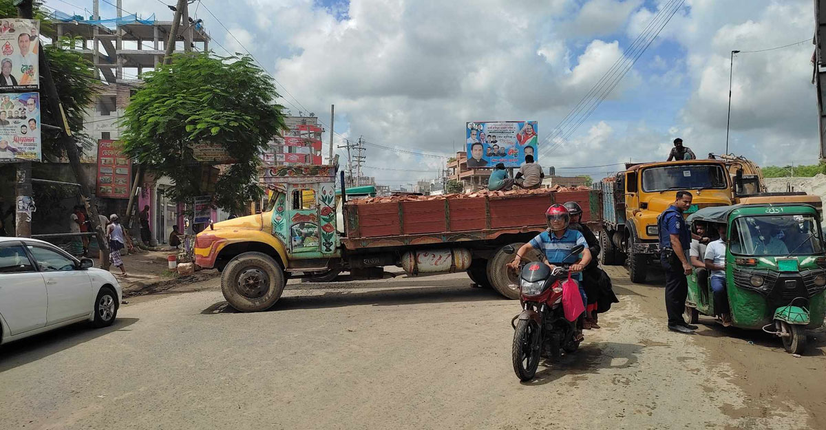 ট্রাক দুটিসহ সেই সড়কের ছবি ধারণ করতে গেলে বাধা দেন সেখানে দায়িত্বপালনকারী পুলিশের এএসআই মহিউদ্দিন। এসময় তিনি এই প্রতিবেদকের আইডি কার্ড দেখতে চান। এরপর পরিচয়পত্র দেখালে তিনি কিছুটা দমে যান। এরপর তার কাছে ট্রাক দুটি রাখার কারণ জানতে চাইলে বলেন, আসলে সড়কে যান চলাচল নিয়ন্ত্রণে এমনটি করা হয়েছে। কিছুক্ষণ পর তুলে নেওয়া হবে।