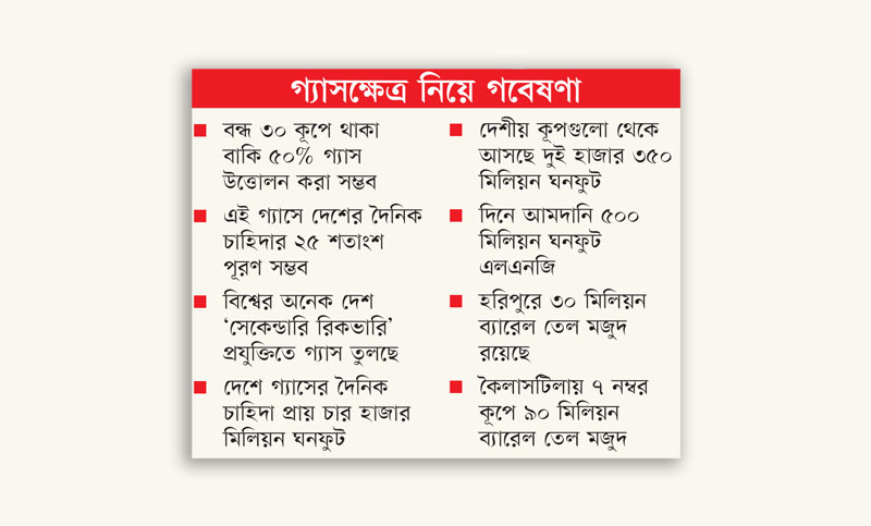 দেশে উৎপাদন বন্ধ হওয়া বিভিন্ন গ্যাসক্ষেত্রের অন্তত ৩০টি কূপে এখনো ৫০ শতাংশ গ্যাস মজুদ রয়েছে। ‘সেকেন্ডারি রিকভারি’ প্রযুক্তি ব্যবহার করে এই গ্যাস উত্তোলন করা সম্ভব। এটা করে দৈনিক এক হাজার মিলিয়ন ঘনফুটের বেশি গ্যাস উৎপাদন বাড়ানো যাবে। বিশ্বের অনেক দেশই ‘প্রাইমারি রিকভারি’ শেষে ‘সেকেন্ডারি রিকভারি’ প্রযুক্তির মাধ্যমে গ্যাস উত্তোলন করছে।