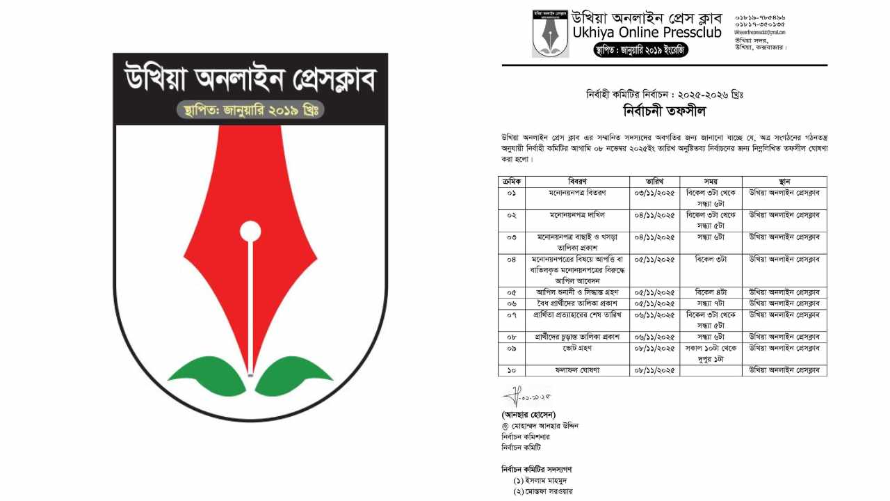 উখিয়া অনলাইন প্রেসক্লাবের কার্যনির্বাহী কমিটির দ্বি-বার্ষিক নির্বাচন ২০২৫-এর তফসিল ঘোষণা করেছে নির্বাচন কমিশন। শনিবার (১ নভেম্বর) ঘোষিত তফসিলে নির্বাচনের দিনক্ষণ নির্ধারণ করা হয়। আগামী ৮ নভেম্বর অনুষ্ঠিত হবে বহুল প্রতীক্ষিত এ নির্বাচন।