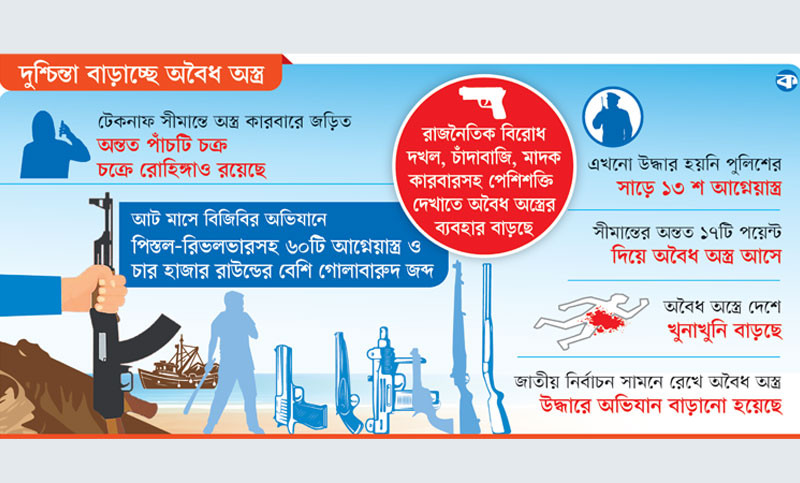বাংলাদেশ-মায়ানমার সীমান্তের সাতটি পথে অবৈধ অস্ত্রের চালান দেশে ঢুকছে। এই অস্ত্রের কারবারে জড়িত রয়েছে কমপক্ষে পাঁচটি চক্র। প্রত্যেক চক্রেই রয়েছে কক্সবাজারের রোহিঙ্গারা। অস্ত্রের চালানের প্রধান গন্তব্য কক্সবাজারের বিভিন্ন রোহিঙ্গা ক্যাম্প ও তিন পার্বত্য জেলার সন্ত্রাসীদের আস্তানা।
